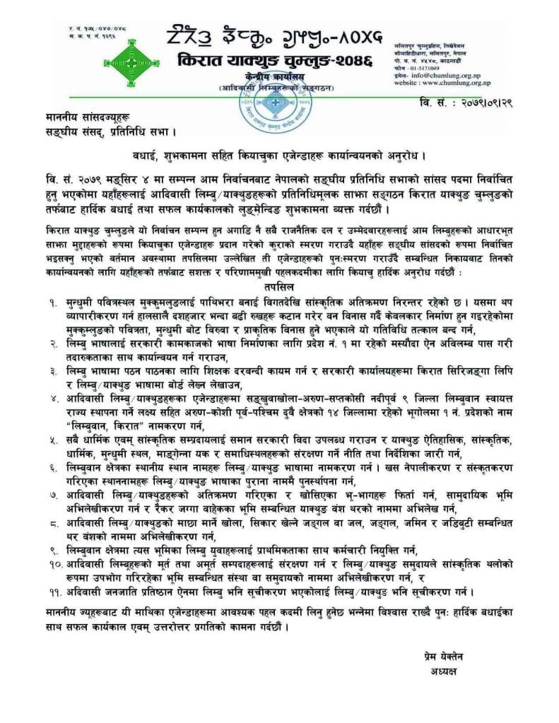 वि.स.२०७९ पुस २९ गते ललितपुर चुम्लुङ हिममा किरात याक्थुङ चुम्लुङ सङ्घिय कार्यसमितिको आयोजनामा मंसिर ४ गते सम्पन्न प्रतिनिधि सभाको निर्वाचनबाट निर्वाचित लिम्बू/ याक्थुङ सांसदहरुलाइ बधाई तथा शुभकामना कार्यक्रम सँगै किरात याक्थुङ् चुम्लुङ्को एजेन्डाहरु कार्यान्वयनको अनुरोध गरेको छ ।