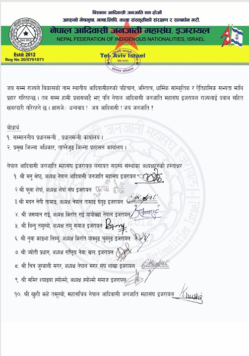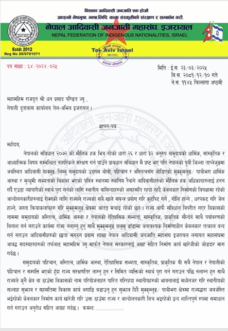 एसियाको मध्यपूर्व इजरायलमा रहेका नेपाली आदिवासी जनजातिहरुको छाता संगठन नेपाल आदिवासी जनजाती महासंघ, इजरायल र महासंघमा आवद्व विविन्न जातिका संस्थाहारुले ताप्लेजुङको मुक्कुमलुङ/ पाथिभरा क्षेत्रमा निर्माण गर्न खोजिएको व्यापारी चन्द्र ढकाल कम्पनीको केबलकार निर्माण कार्य तत्काल रोक्न मात्र होइन खारेज गर्नुपर्ने माग सहित इजरायल स्थित नेपाली राजदुतावास मार्फत प्रधानमन्त्री खड्ग प्रसाद ओली र ताप्लेजुङ जिल्ला प्रसाशन कार्यालयलाई संयुत्त ज्ञापन-पत्र बुझाएकोछ।